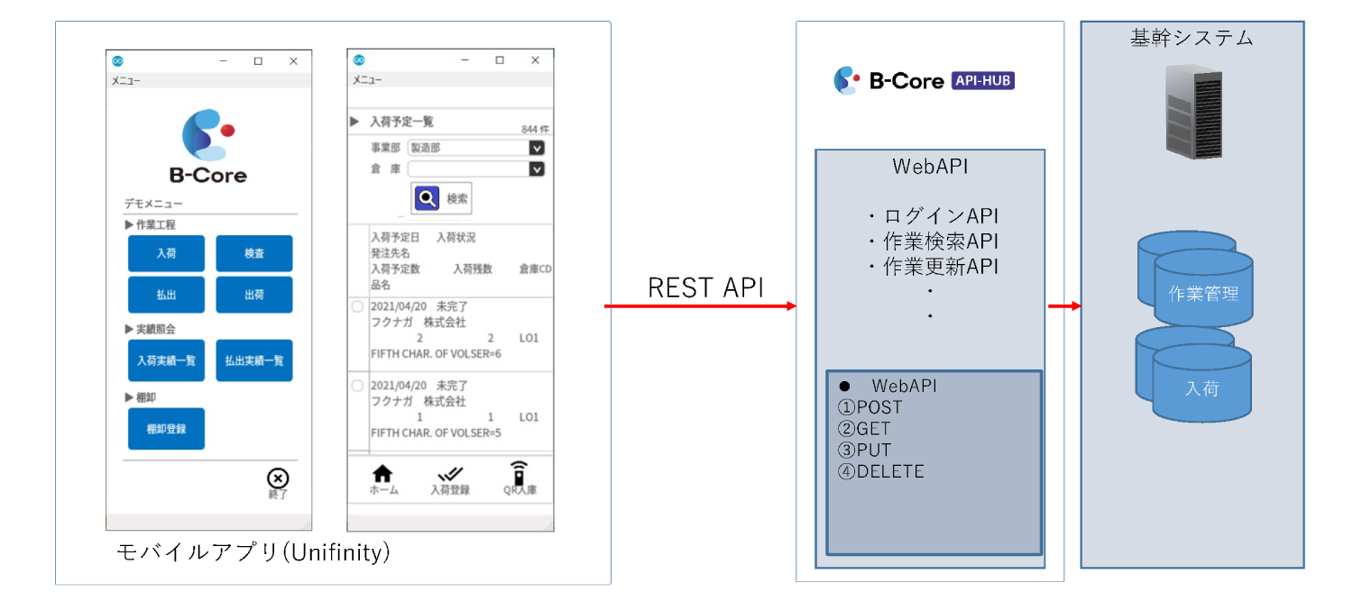 基幹システムをAPI化させ、モバイルアプリケーションと基幹システムをリアルタイム連携させることができます。
